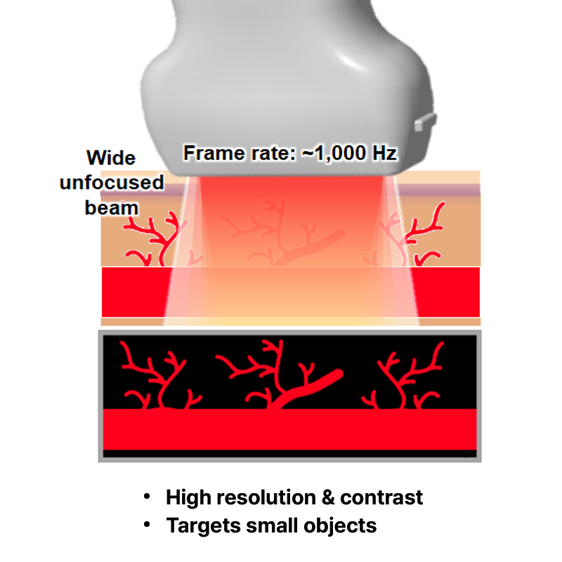 Conventional Ultrasound Imaging provides high-resolution images using focused scanline acquisition but is limited by relatively slow frame rates.