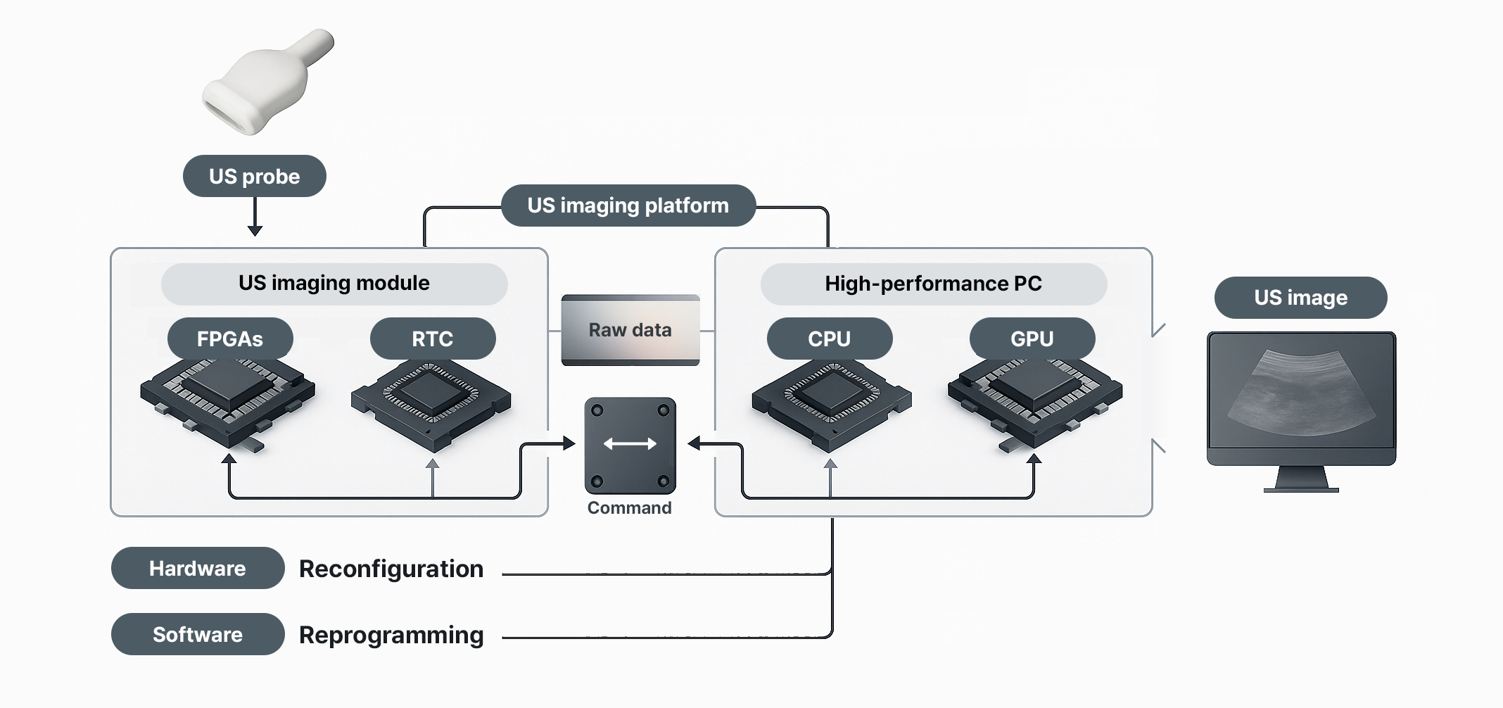 The Opticho system is designed for versatility. It accommodates multiple probe types, offers flexible signal transmission and data acquisition, and ensures high-speed PCIe data transfer. A dedicated GPU enables real-time image processing and custom algorithm development. Researchers have direct access to RF data and can accelerate new imaging methods using distributed computing across FPGAs, CPUs, and GPUs.